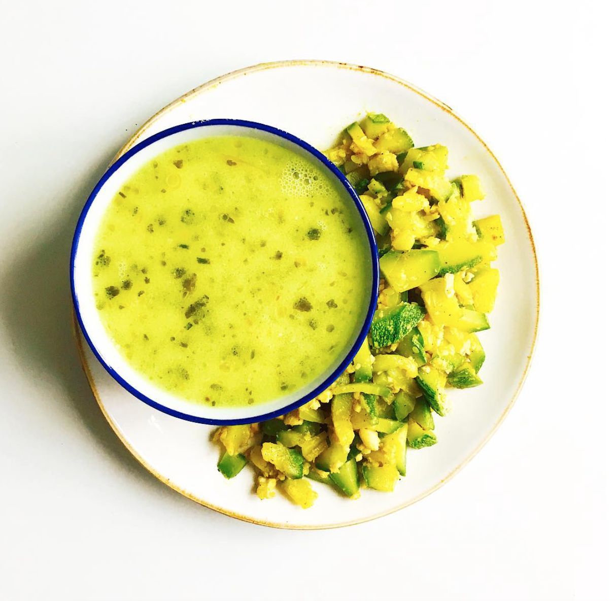 J’aime beaucoup déguster cette soupe avec un sauté de légumes tout simple en accompagnement, réalisé avec les légumes que je trouve dans mon frigo et les noix (cajou, amandes, pignons…) que j’ai à dispo dans mes placards.